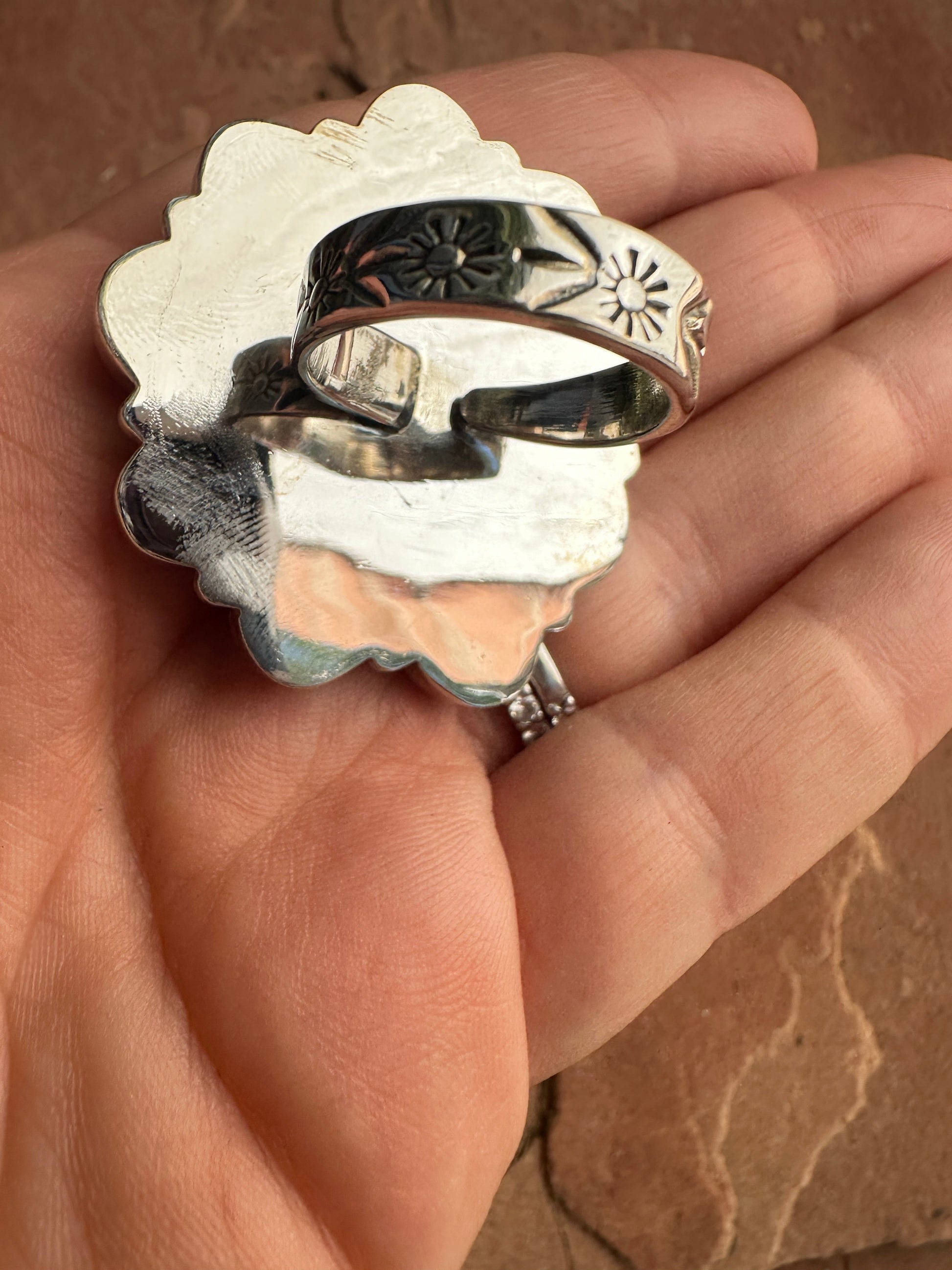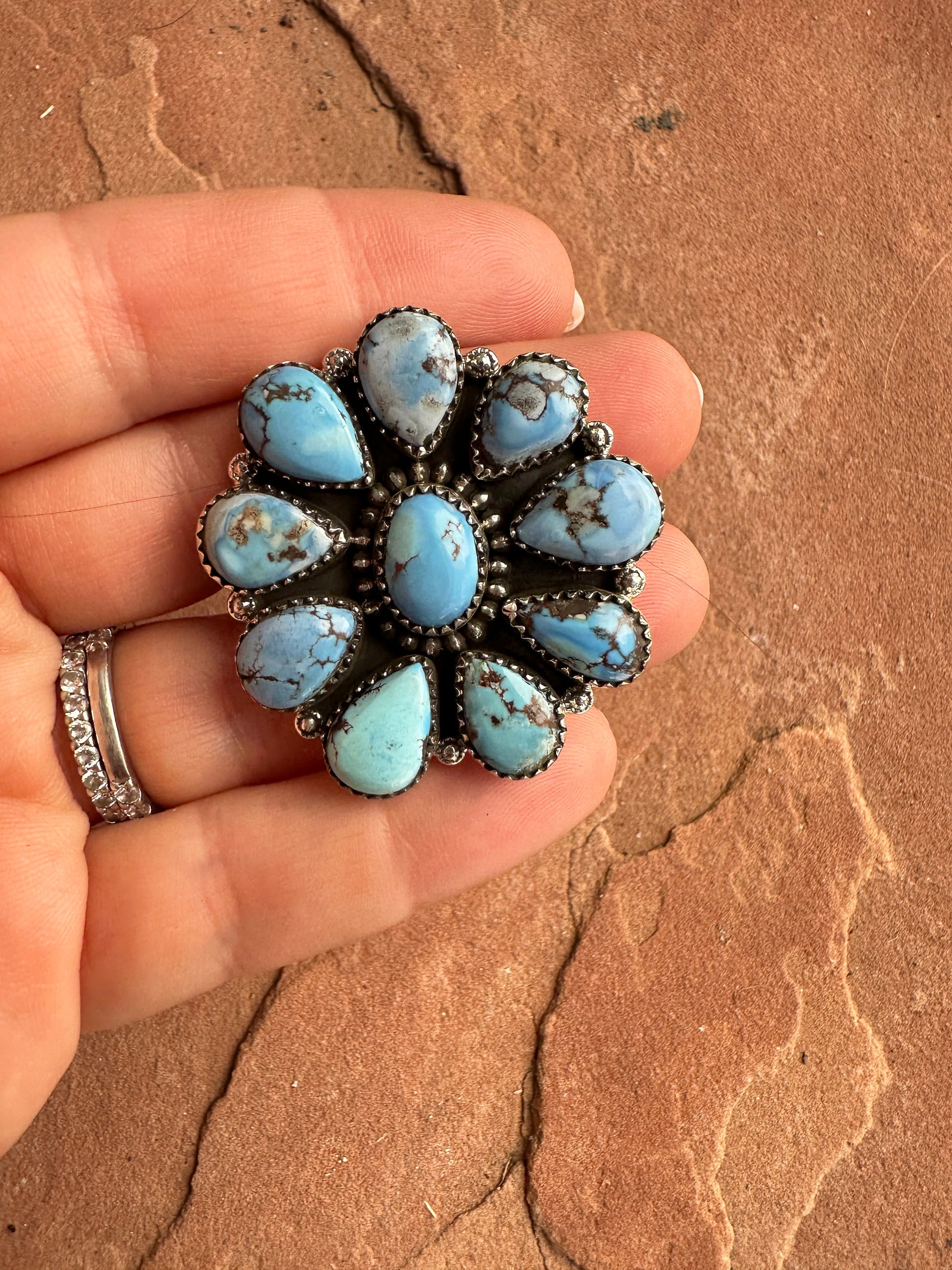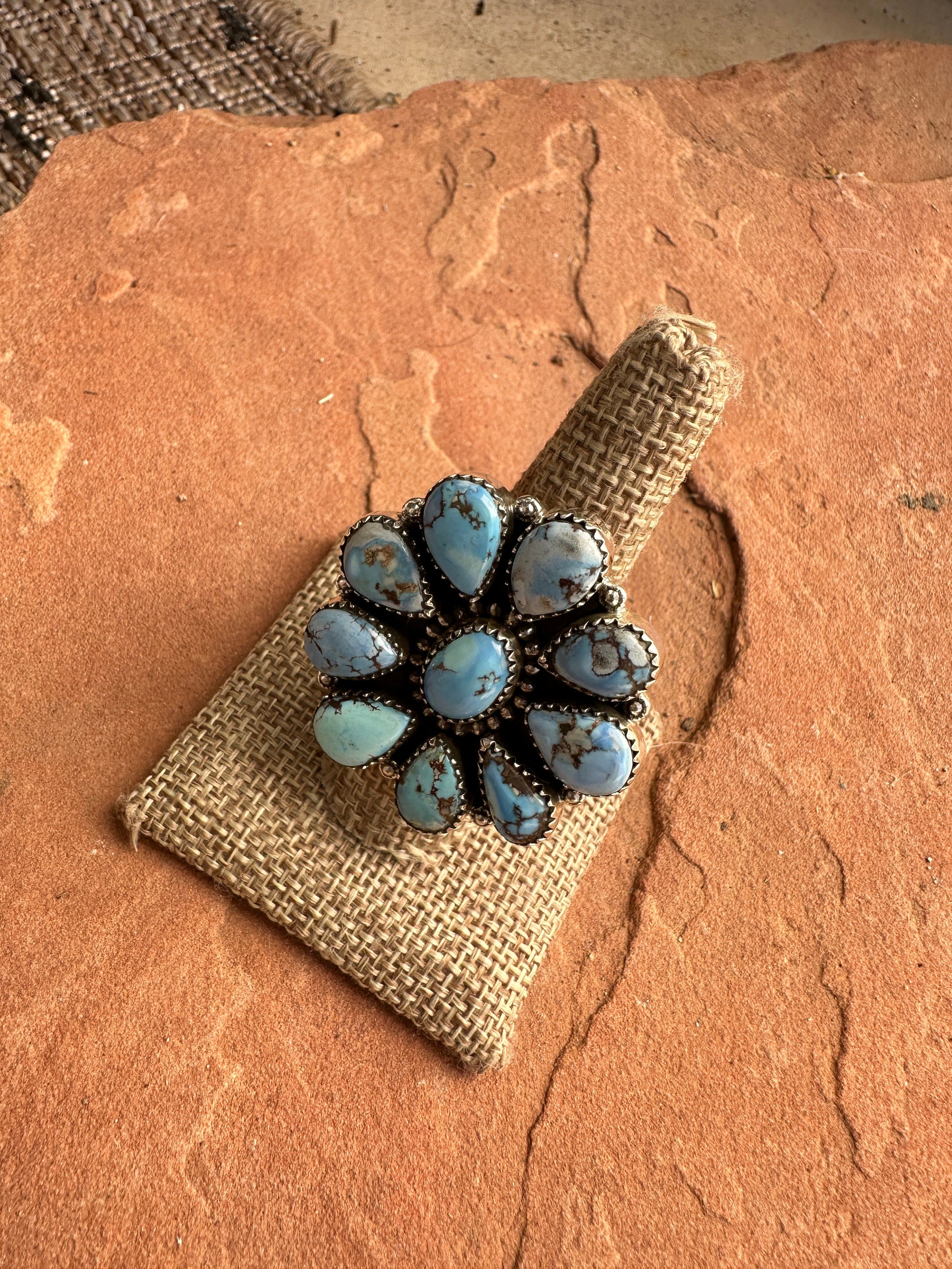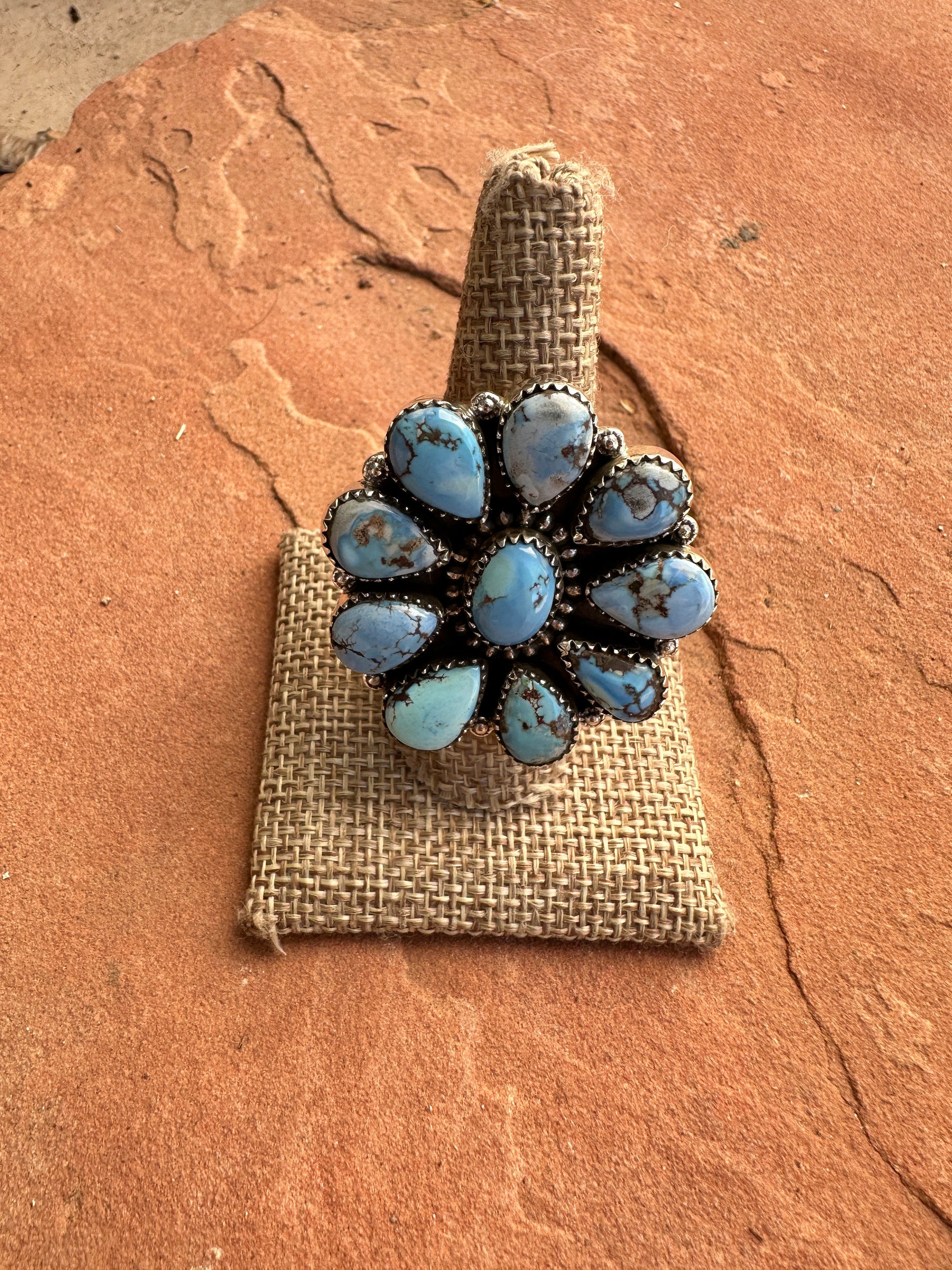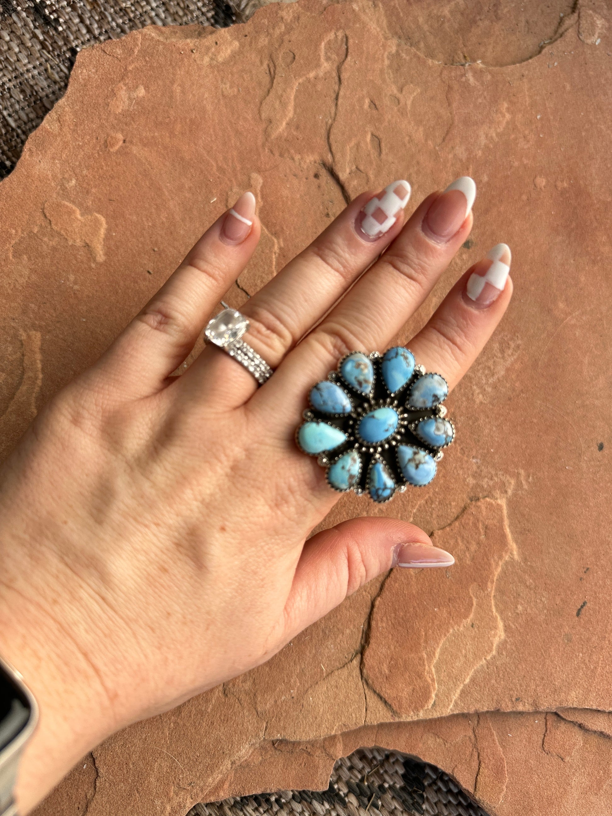 Beautiful Handmade Golden Hills Turquoise And Sterling Silver Adjustable Cluster Flower Ring