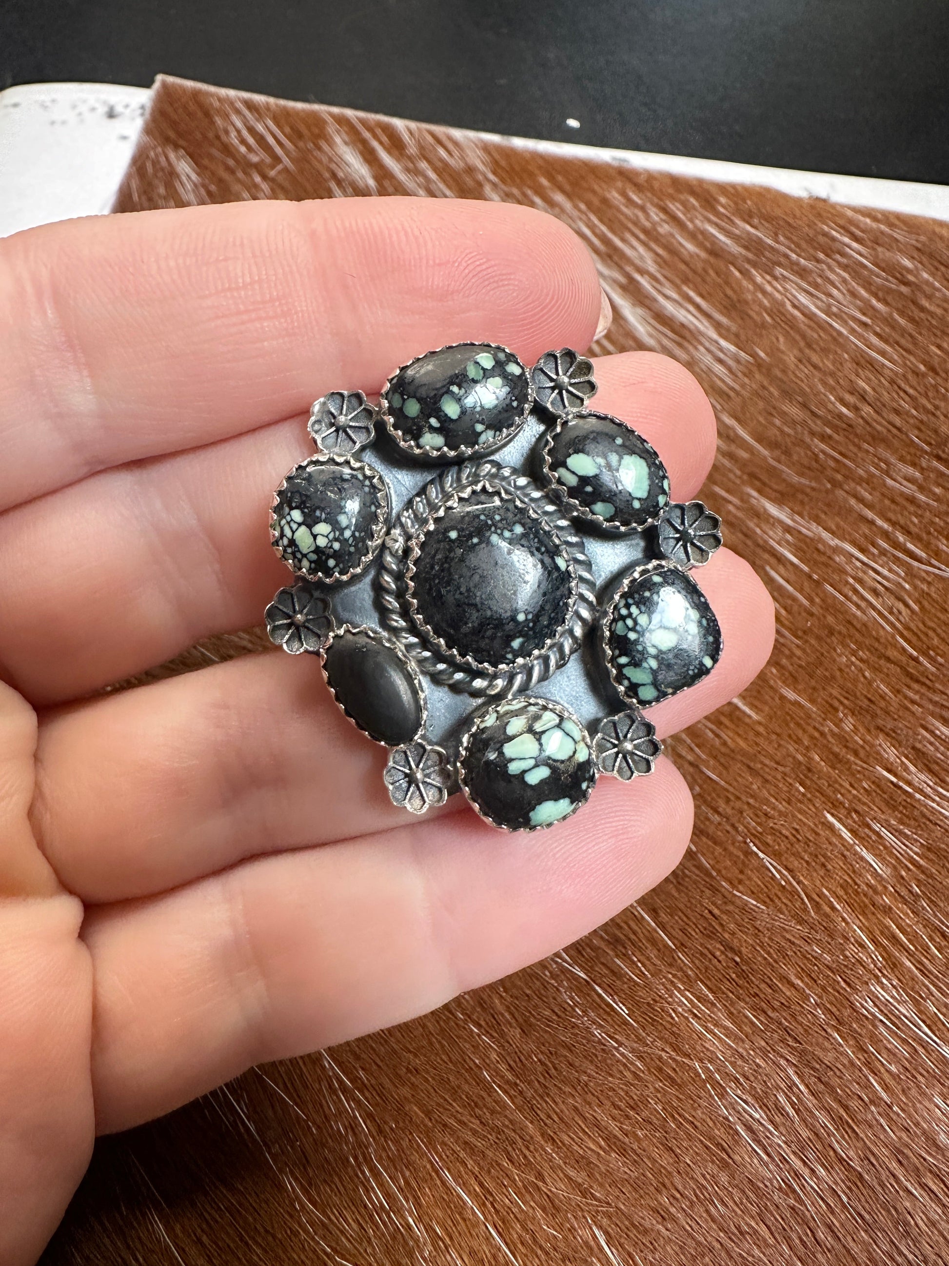 Adjustable in size to wear on any finger. Beautiful Turquoise stones. Beautiful details. Really great Ring. Measuring 1 1/2 inch long and 1 3/8 inch wide . Signed Nizhoni and stamped Sterling.