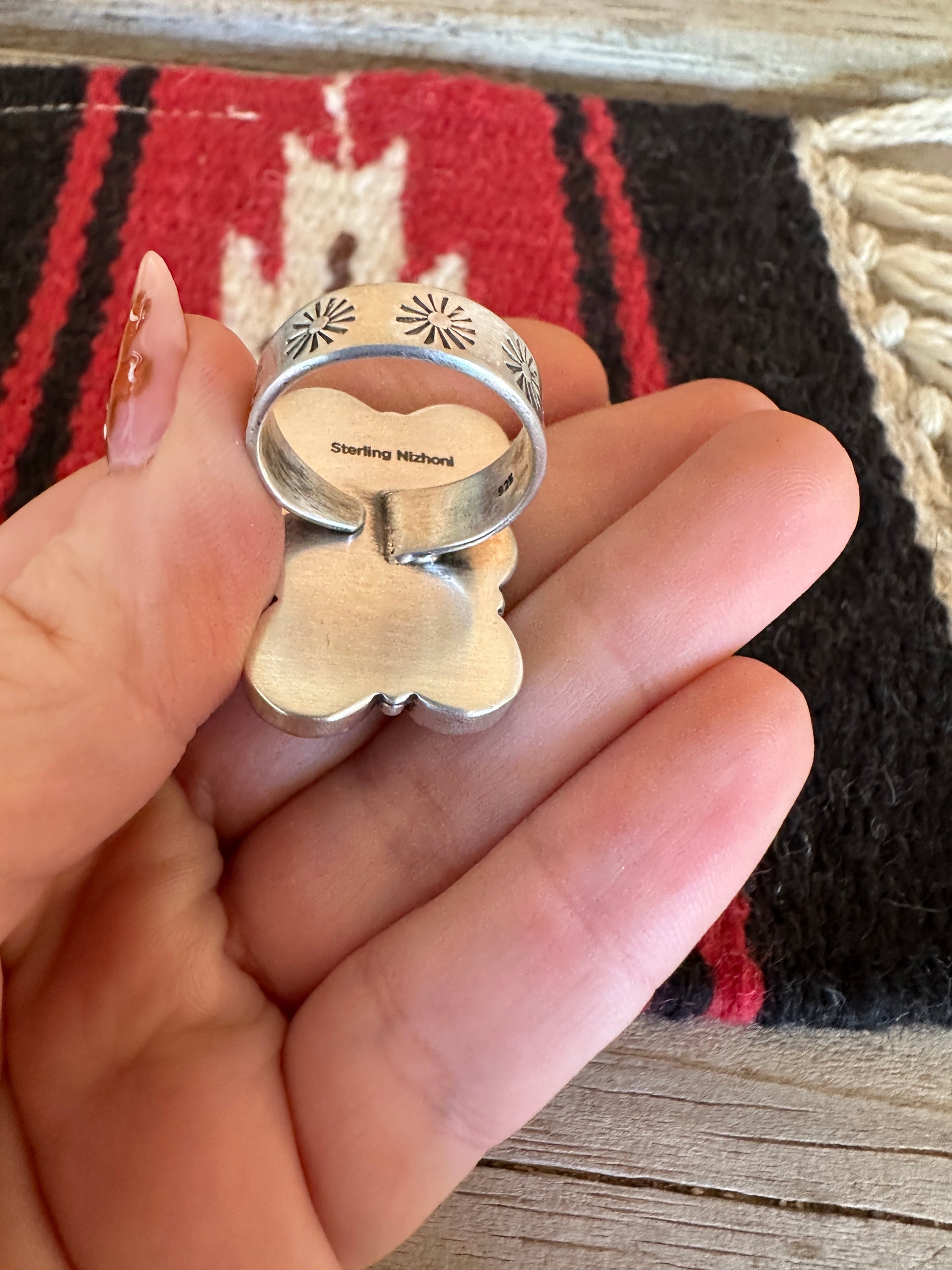 Adjustable in size to wear on any finger. Beautiful stones. Beautiful details. Really great Ring. Measuring 1 1/4 inch long and 7/8 inch wide . Signed Nizhoni and stamped Sterling.