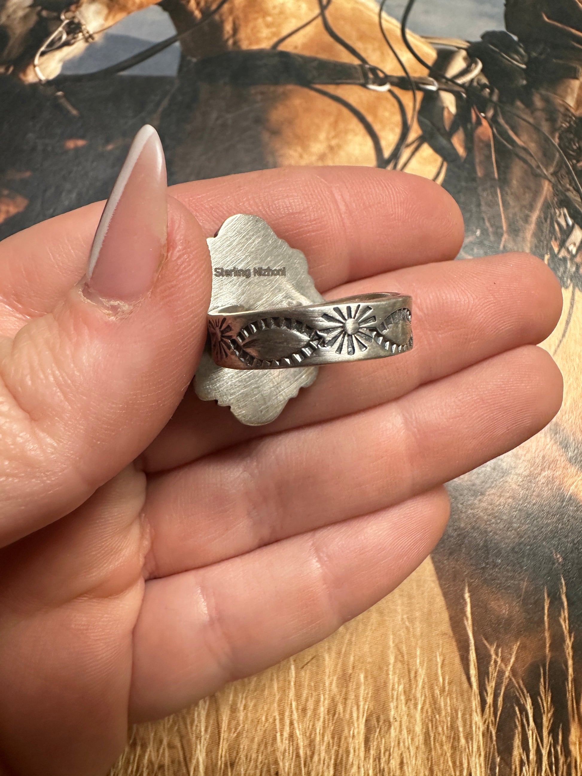 Gorgeous Handmade Palomino Turquoise And Sterling Silver ring. Adjustable in size to wear on any finger. Beautiful stones. Beautiful details. Really great Ring. Measuring 1 inch long and 1 inch wide . Signed Nizhoni and stamped Sterling.