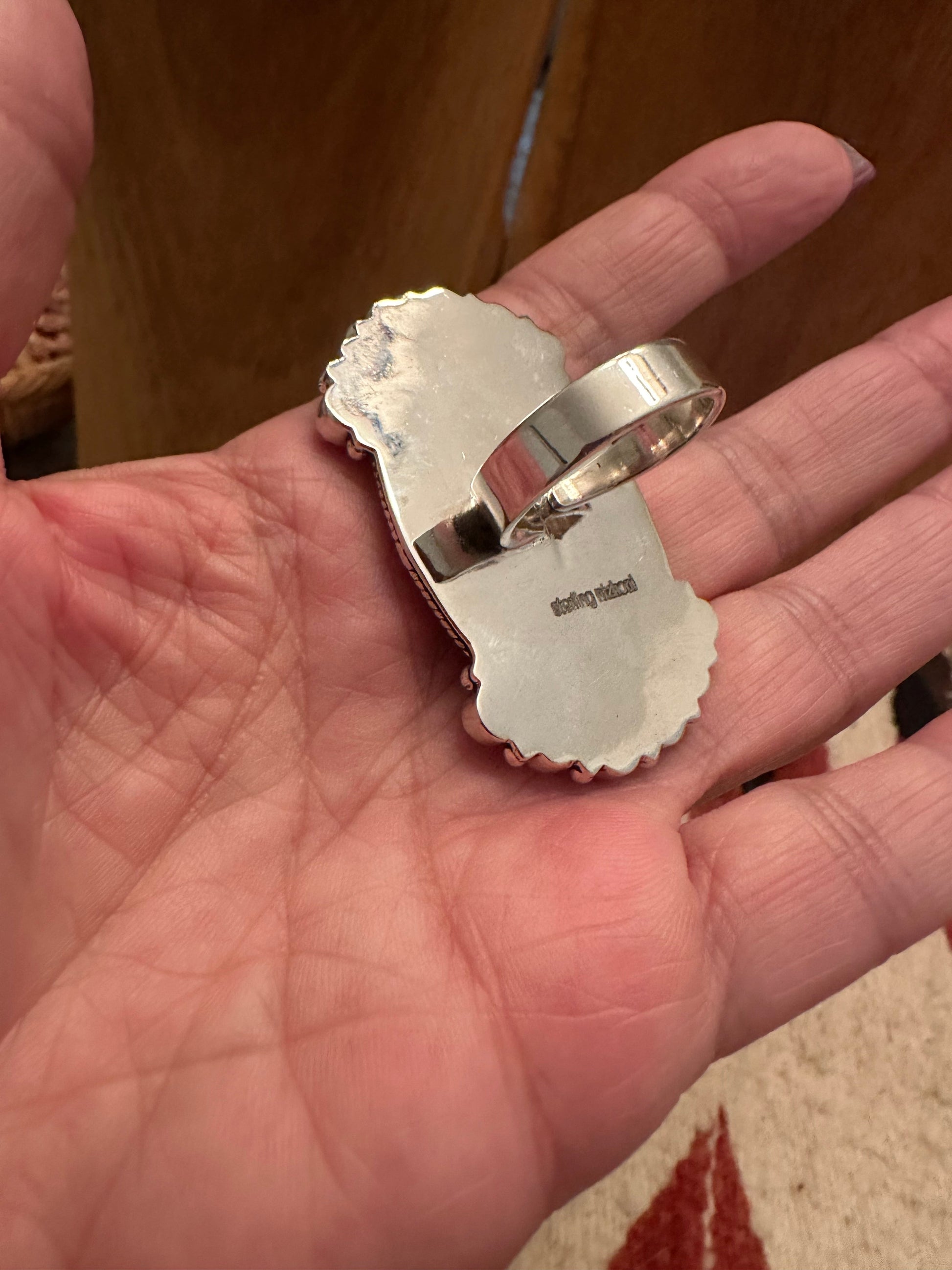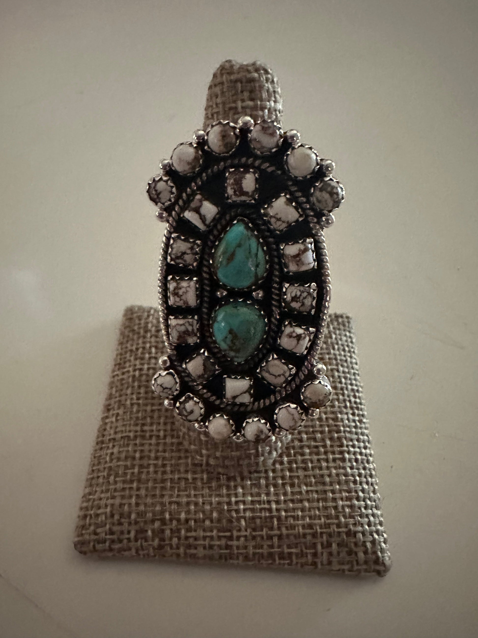 Gorgeous Handmade Turquoise and Wild Horse Sterling Silver Ring. Size is adjustable. Such a pretty ring! Beautiful craftsmanship. Measures 2 inches long and 1 1/4 inch wide. Stamped Sterling and Nizhoni. Stones will vary due to the fact they are natural.