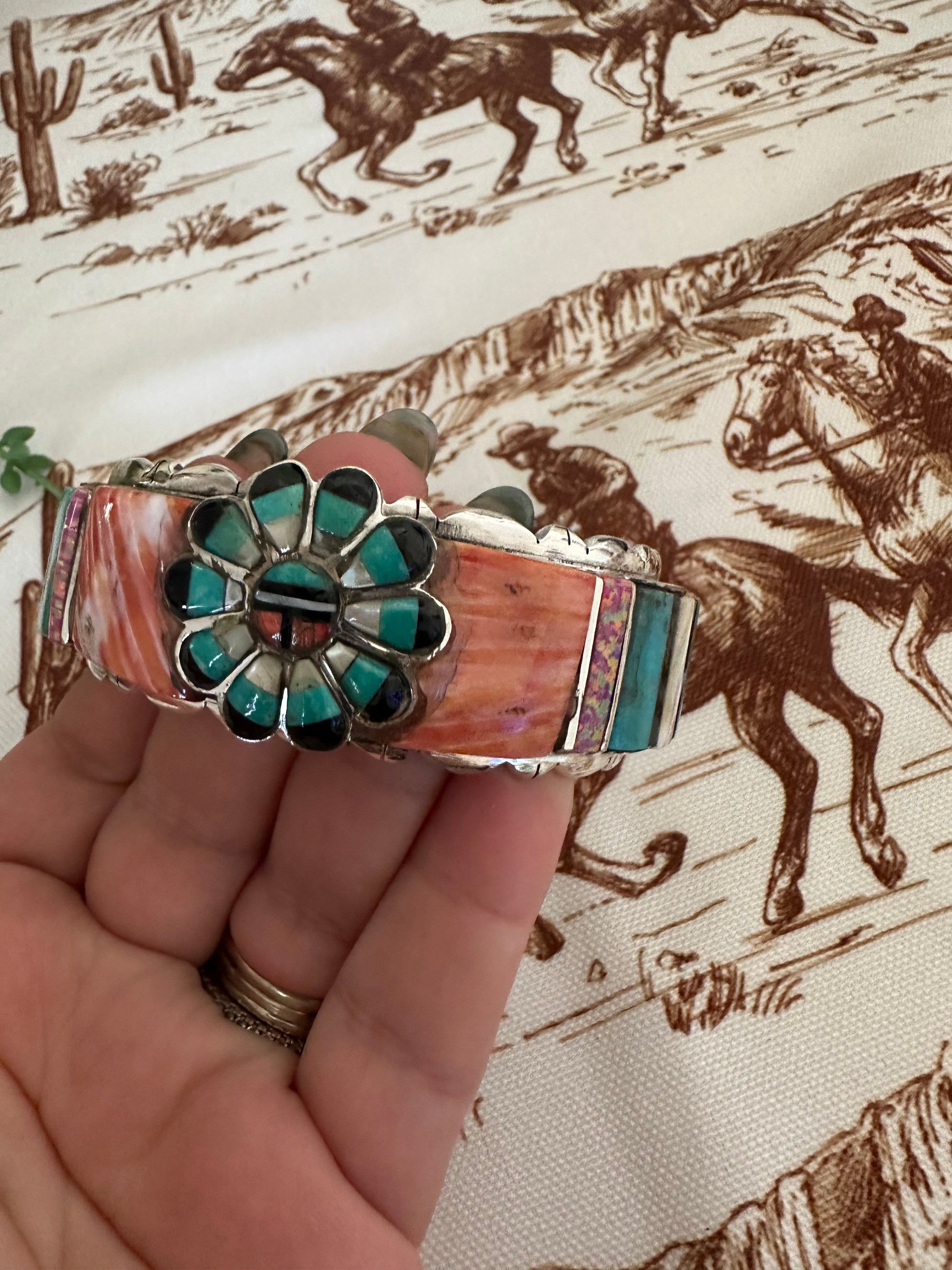 Gorgeous Handmade Multi Stone Inlay Sterling Silver Cuff Bracelet. Beautiful craftsmanship! Cuff has an inside circumference of 5.5 inches with a 1 inch gap. Width is 1 inch.