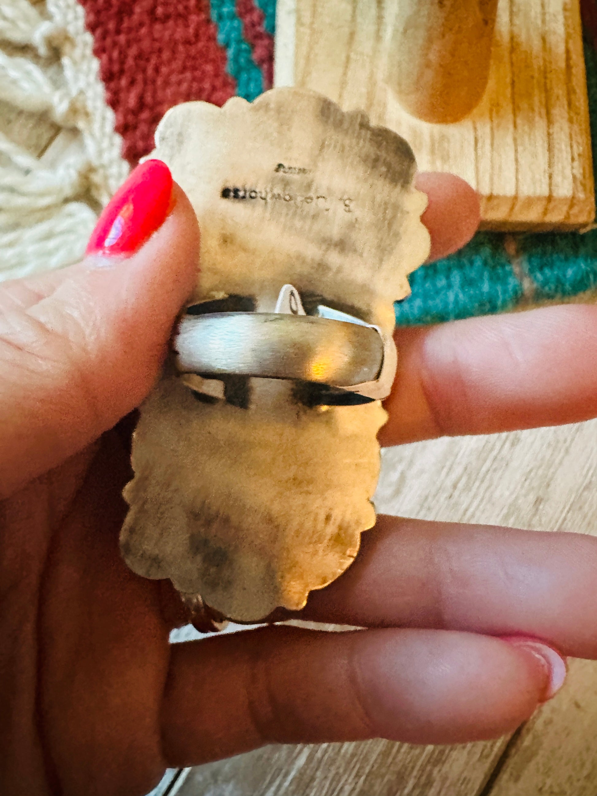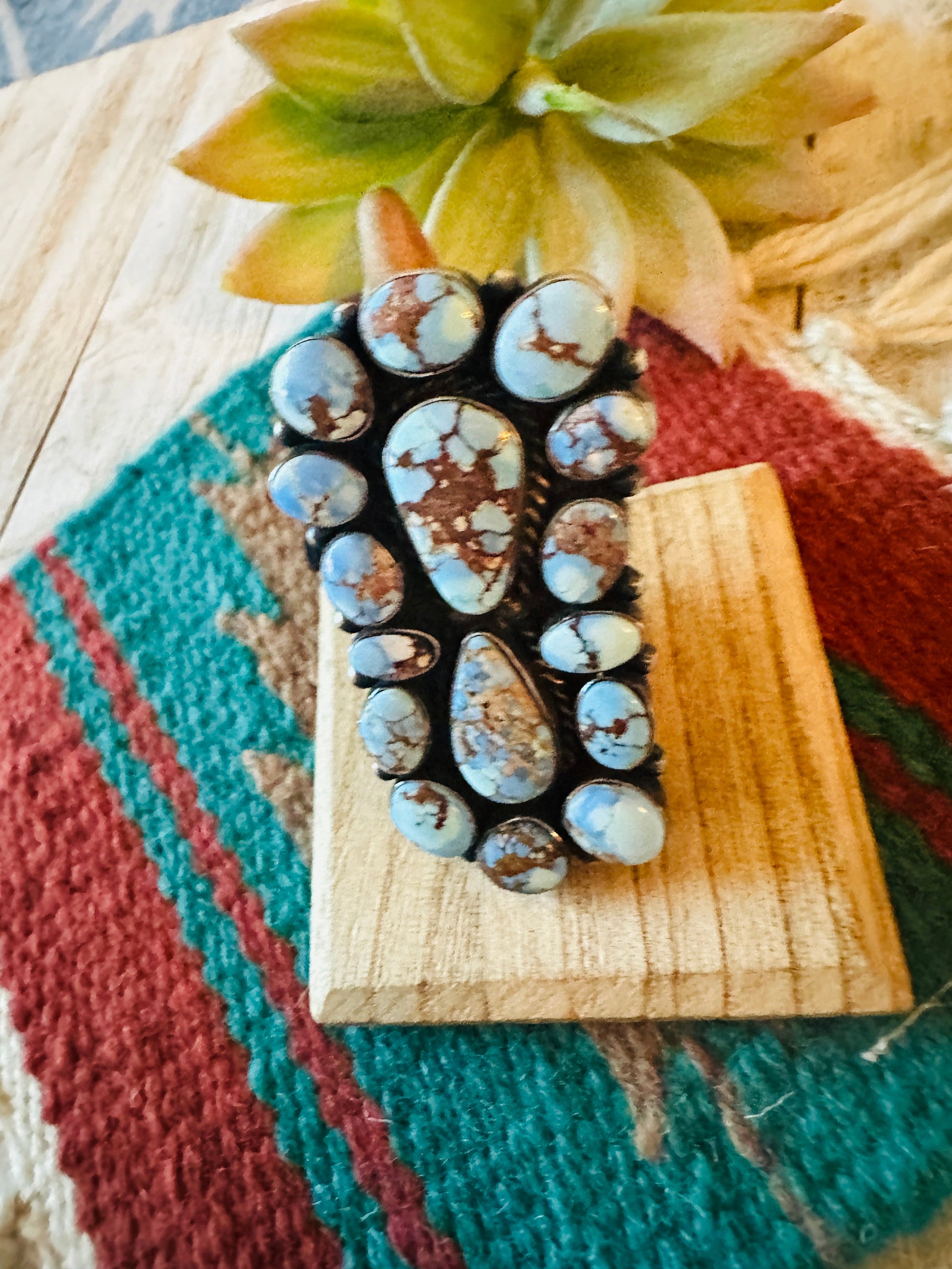 Gorgeous Navajo Golden Hills Turquoise and Sterling Silver Cluster Ring. Size 9.5. Such amazing stones in this ring! Ring measures 2 3/4 inches long and 1 5/8 inches wide. Signed by the artist and stamped Sterling.