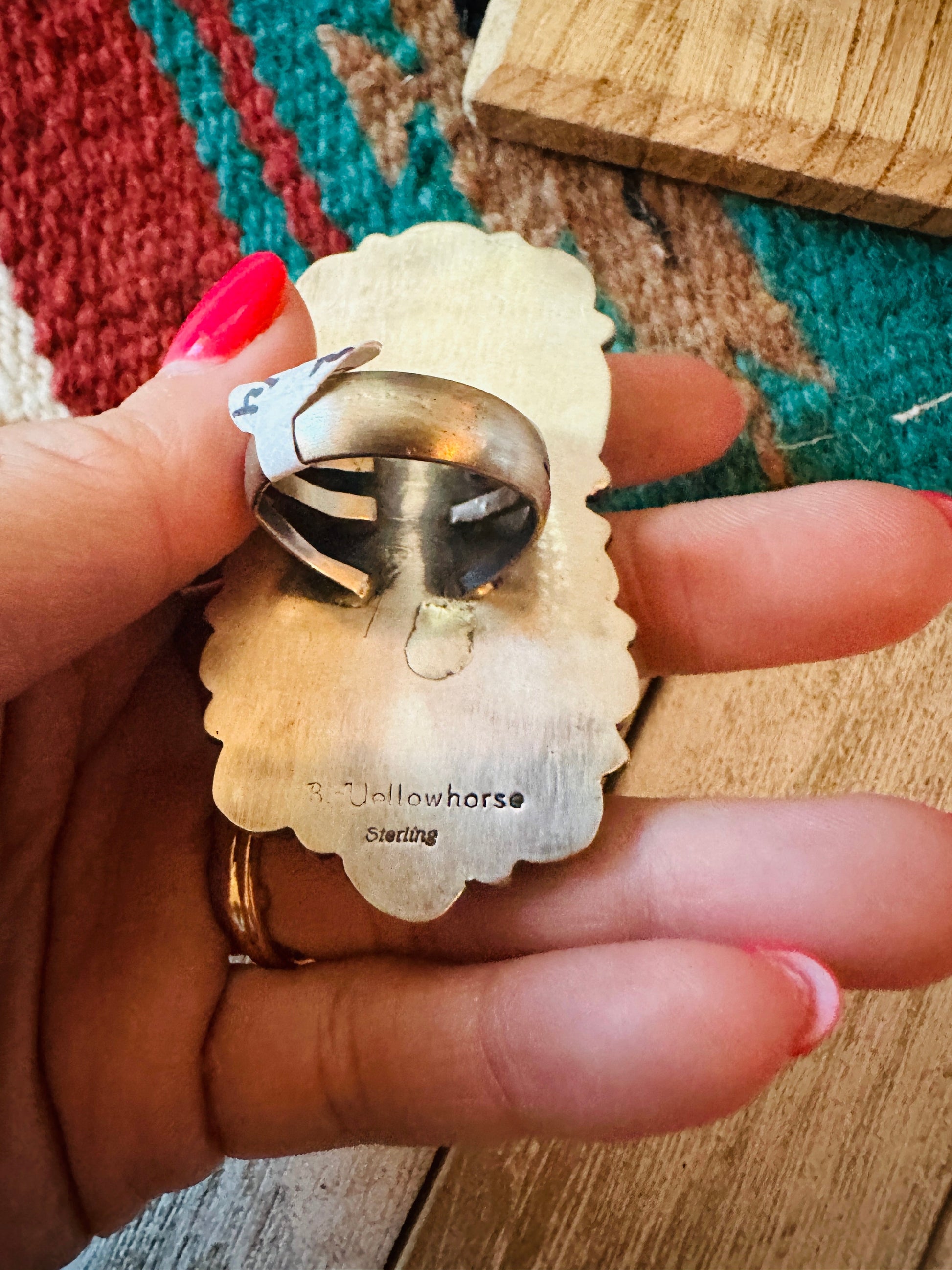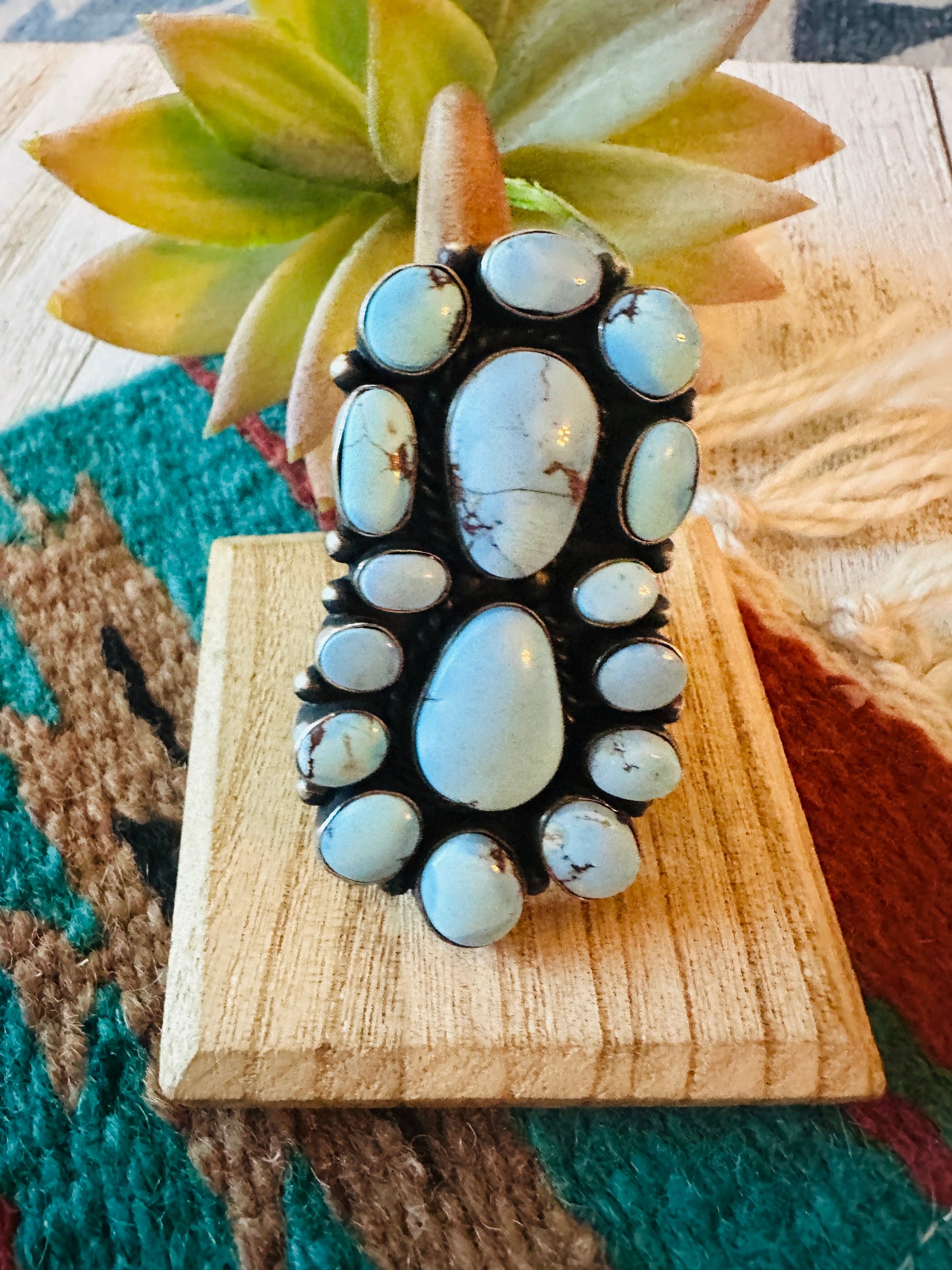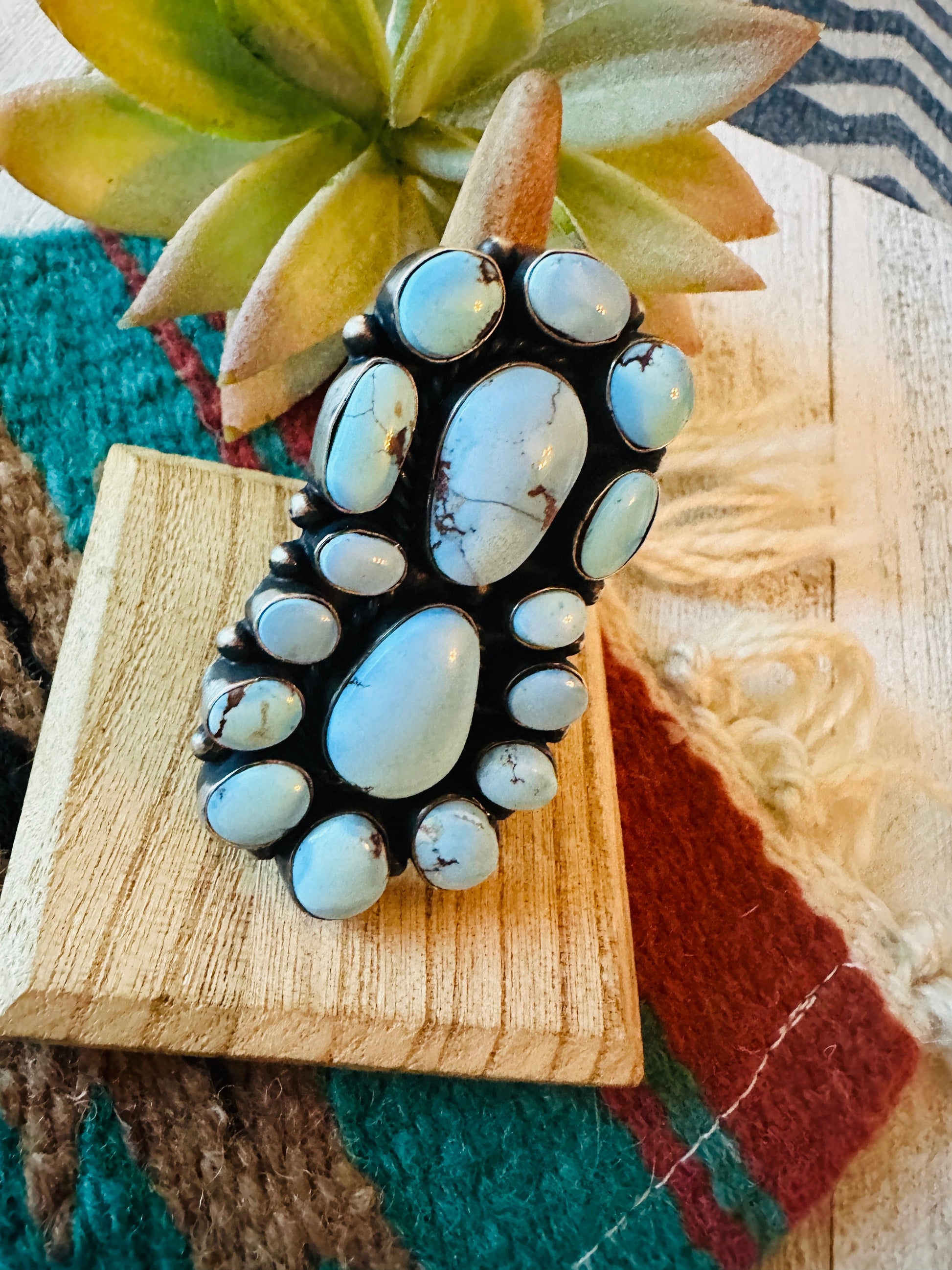 Gorgeous Navajo Golden Hills Turquoise and Sterling Silver Cluster Ring. Size 8.25. Such amazing stones in this ring! Ring measures 2 1/2 inches long and 1 3/8 inches wide. Signed by the artist and stamped Sterling.