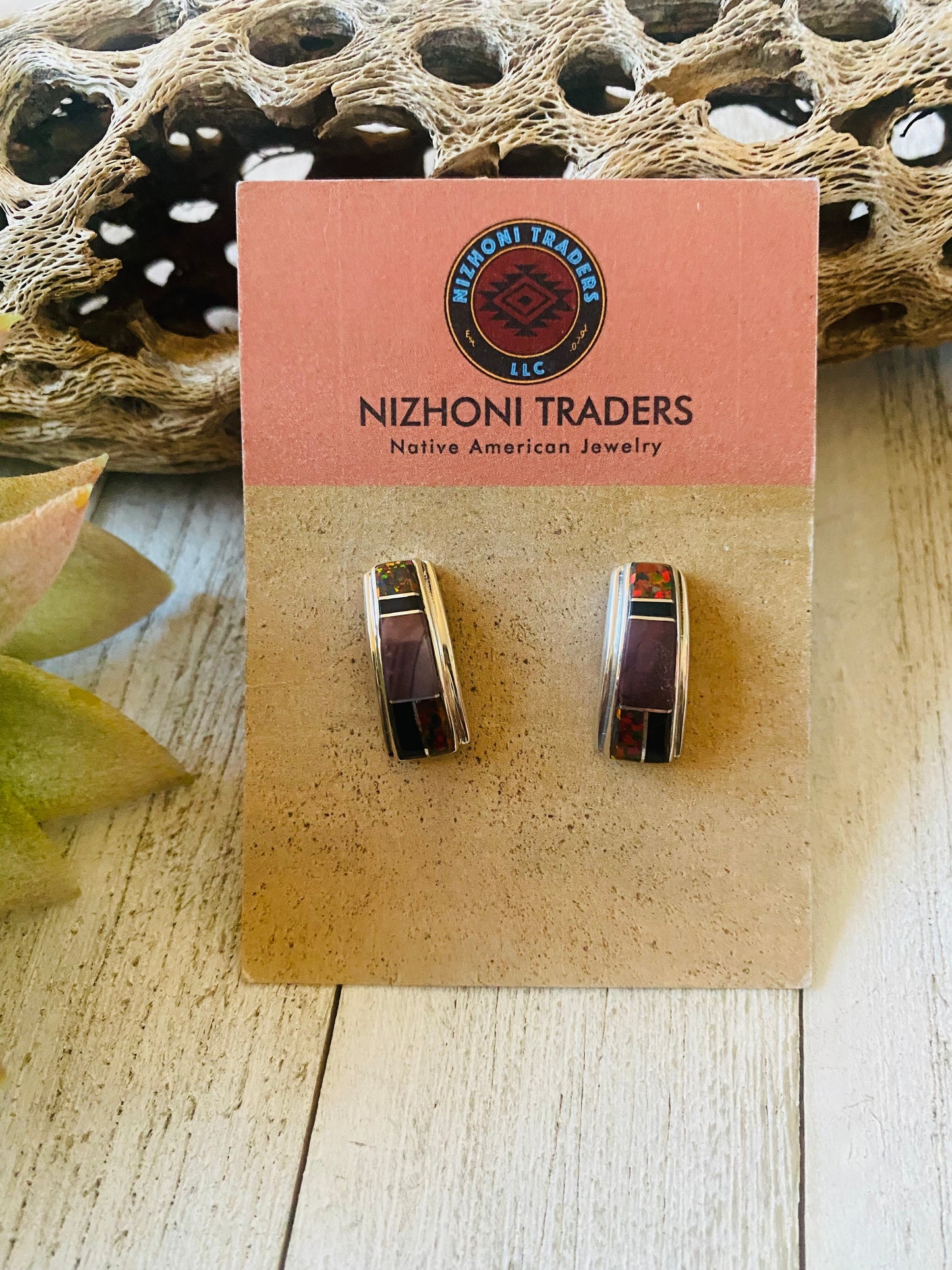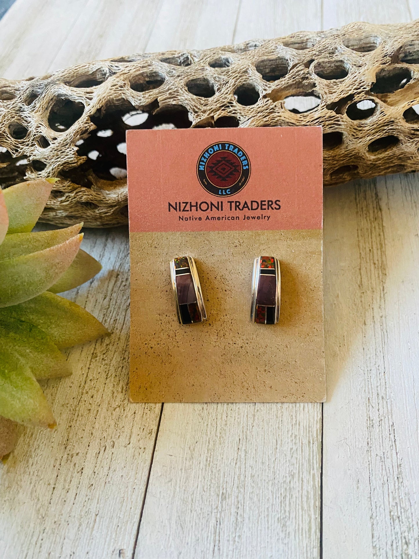 Beautiful Navajo Opal, Spiny Oyster, Onyx & Sterling Silver inlay dangle earrings. Stunning colors and inlay work in these earrings. Stamped Sterling and signed by the artist. The beauties measure 7/8 of an inch long and 3/8 of an inch wide.